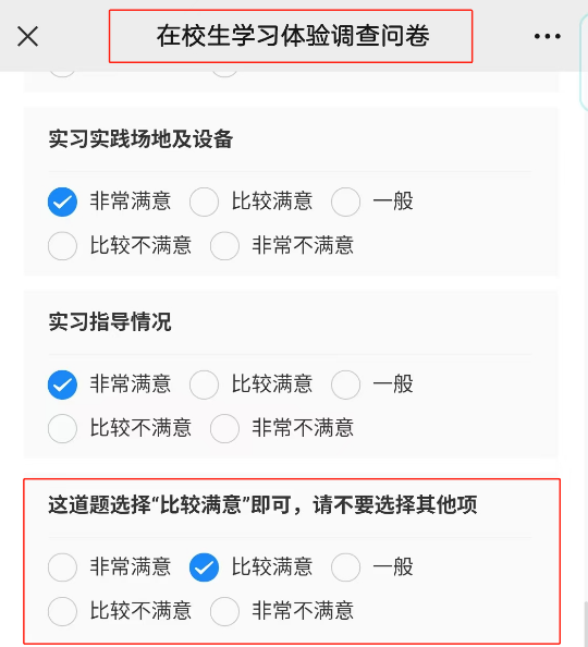 3.教师教学体验调研、在校生学习体验调研各有2道题为验证题(如未选指定选项,则视为无效问卷),请务必向各位老师、学生说明情况,按照题目要求选择选项。