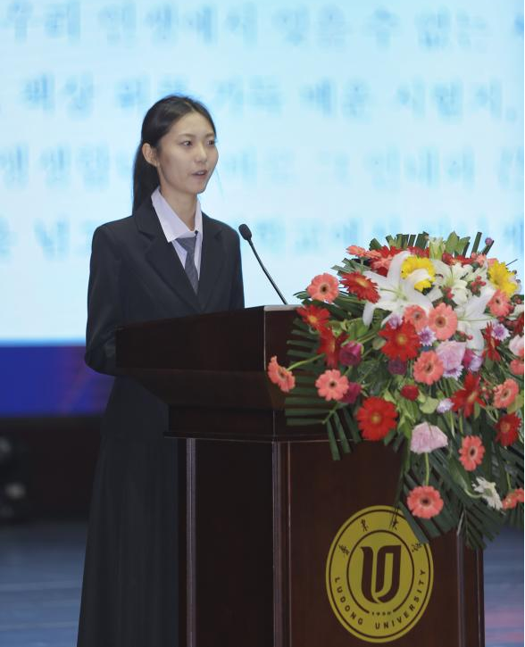 教师代表仲赛凤从专业的角度强调了韩国语学习和工科实践的重要性,希望同学们脚踏实地、坚持不懈,将热爱转化为专长,做到眼底有光、心中有梦。